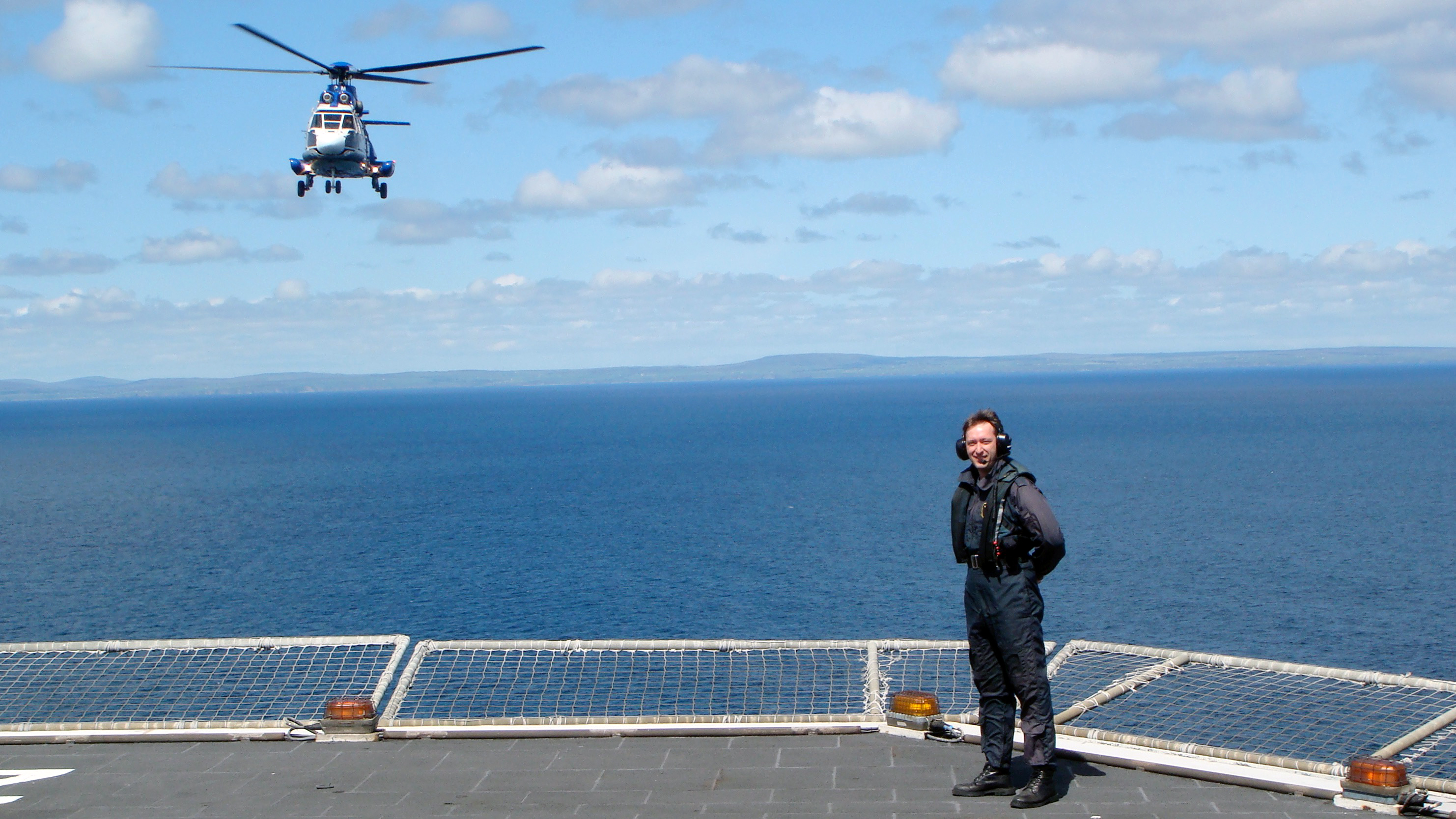 Guy Holmes shown on a platform in his early days with Graham Chiverton flying alongside in an AS332L1 Super Puma, also known as the Bristow Tiger.