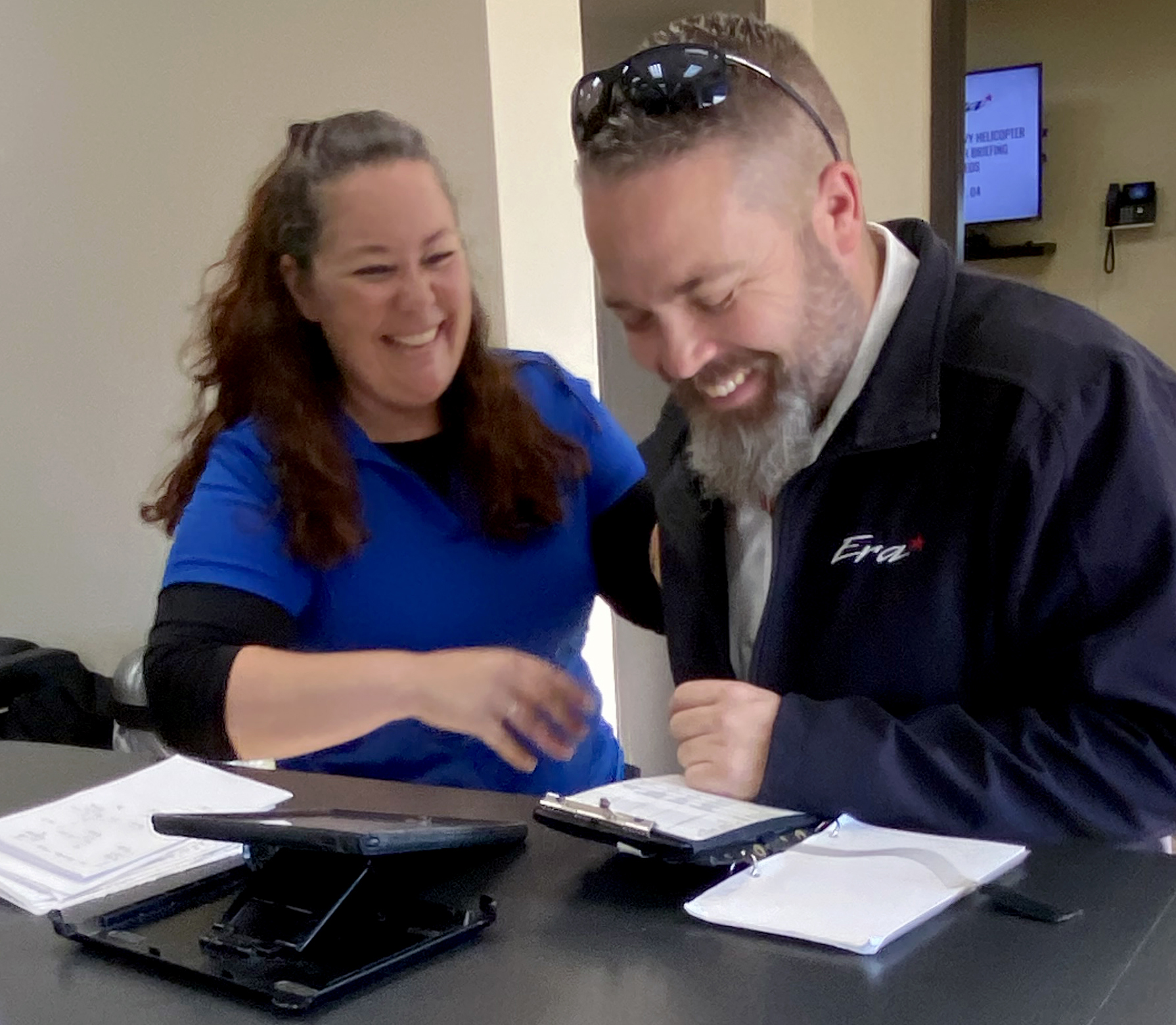 Jackie Galliano shares a laugh with S-92 IFR Captain Brian Bodily.